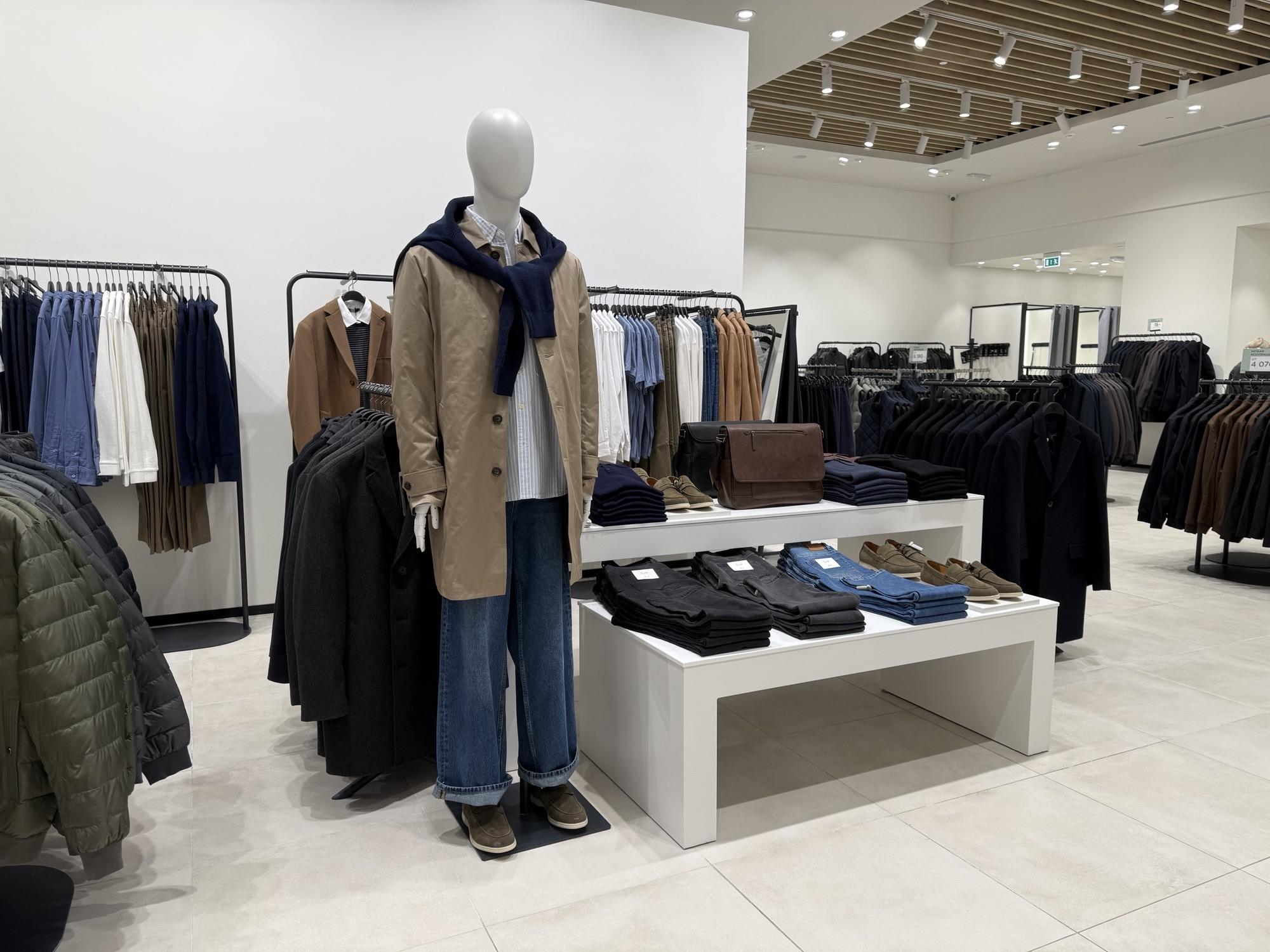 Площадь нового бутика на первом этаже ТРЦ составляет 415 квадратных метров. В ассортименте представлены мужские коллекции, включая одежду из денима и базовый трикотаж.