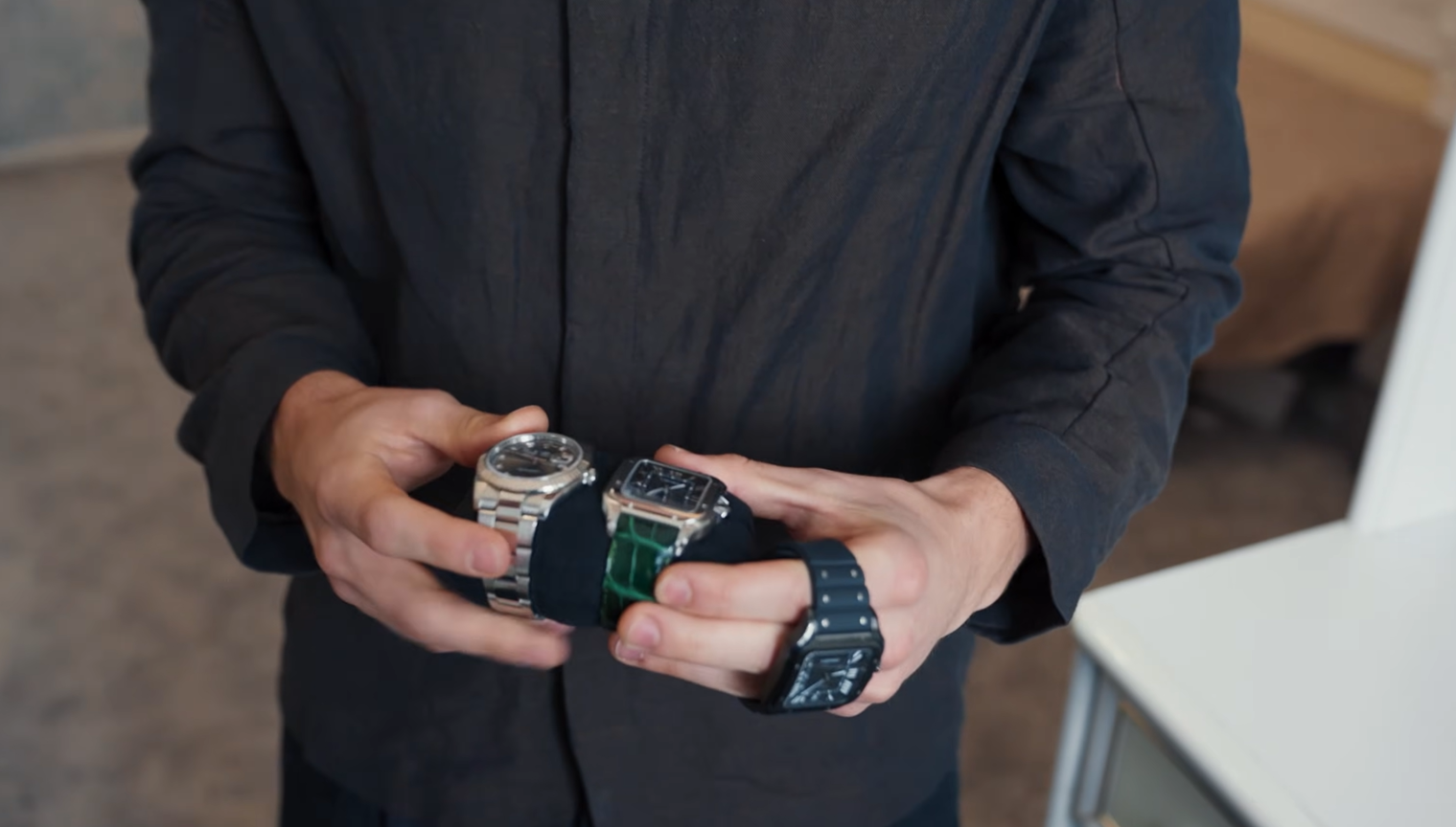 - Еще одна модель в коллекции — Cartier Santos Large с зеленым ремешком. Такие часы, по предварительным оценкам, могут стоить около 720 000 рублей по текущему курсу.