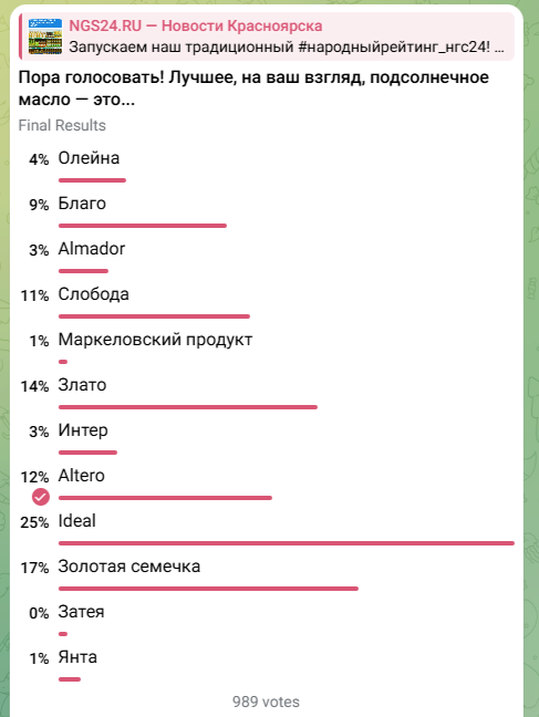 В телеграм-канале прошло голосование, в рамках которого красноярцы выбирали наиболее предпочтительную марку подсолнечного масла из представленных в магазинах.
