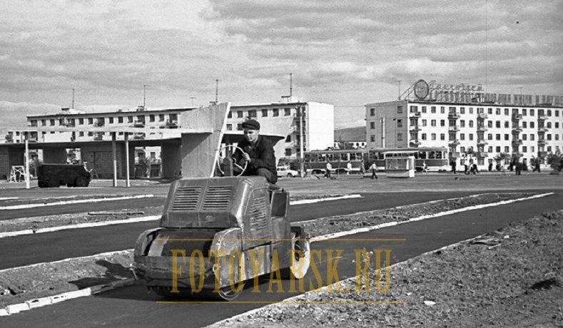 На одной из фотографий 1960-х годов видно, как асфальтовый каток укатывает пешеходные дорожки. «На заднем плане видны конструкции конечной остановки, а также пятиэтажки, с которых началась каменная застройка правого берега», — отмечается в телеграм-канале «Красноярск Исторический».