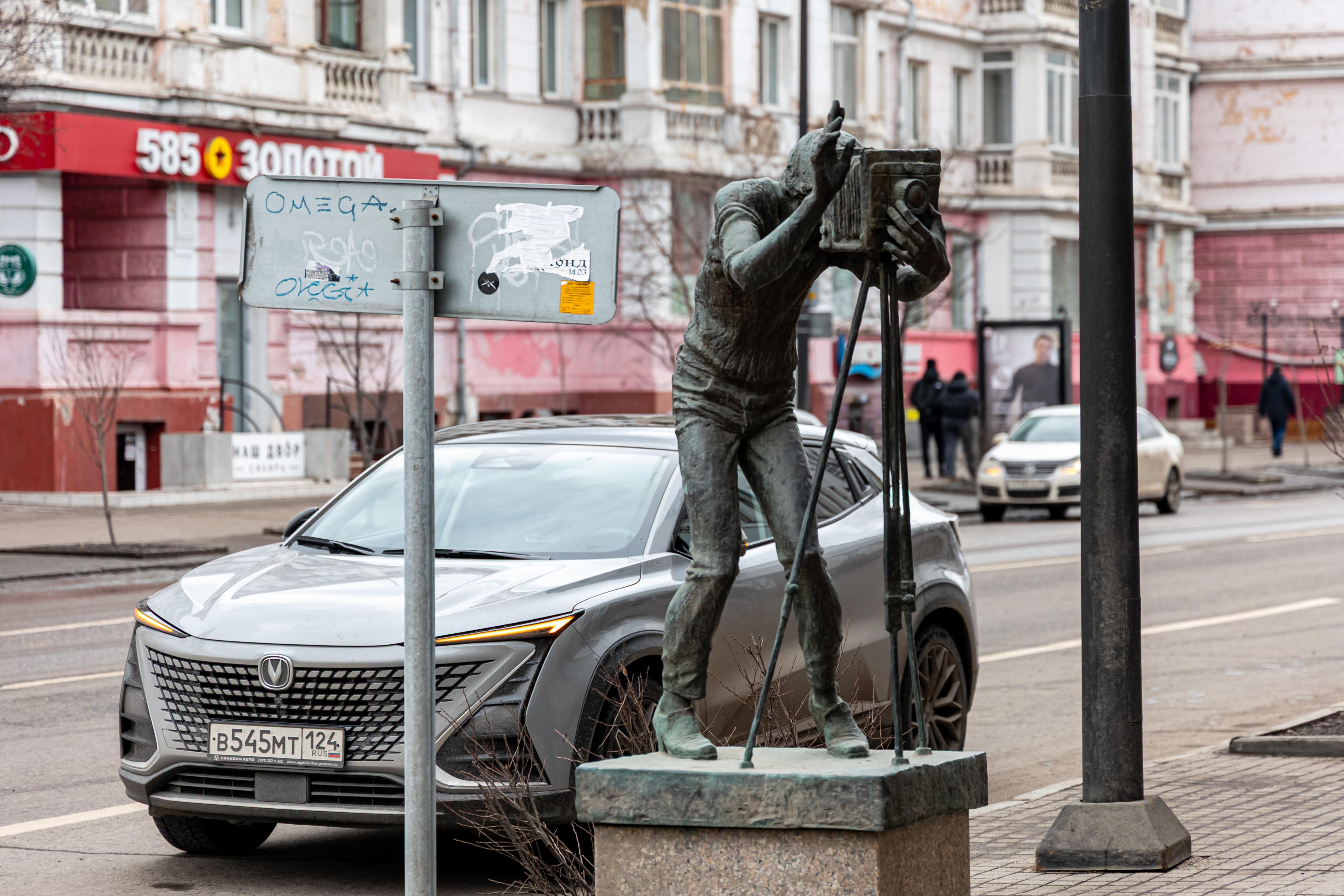 В отличие от других, скульптура фотографа на проспекте Мира, созданная Андреем Кияницыным в 2003 году, не имеет заметных потертостей. Интересная деталь — фотограф одет по-современному, но держит в руках раритетный аппарат с гармошкой.