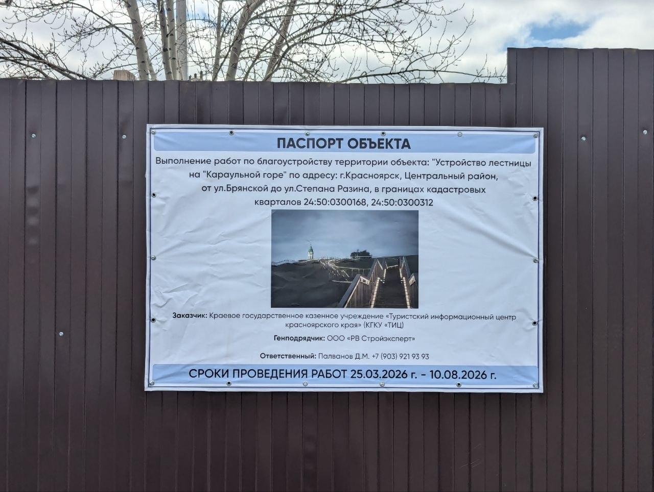 Согласно данным на паспорте, новую лестницу планируют сдать к 10 августа 2026 года. Датой начала работ указано 25 марта, но активная фаза строительства пока не началась.