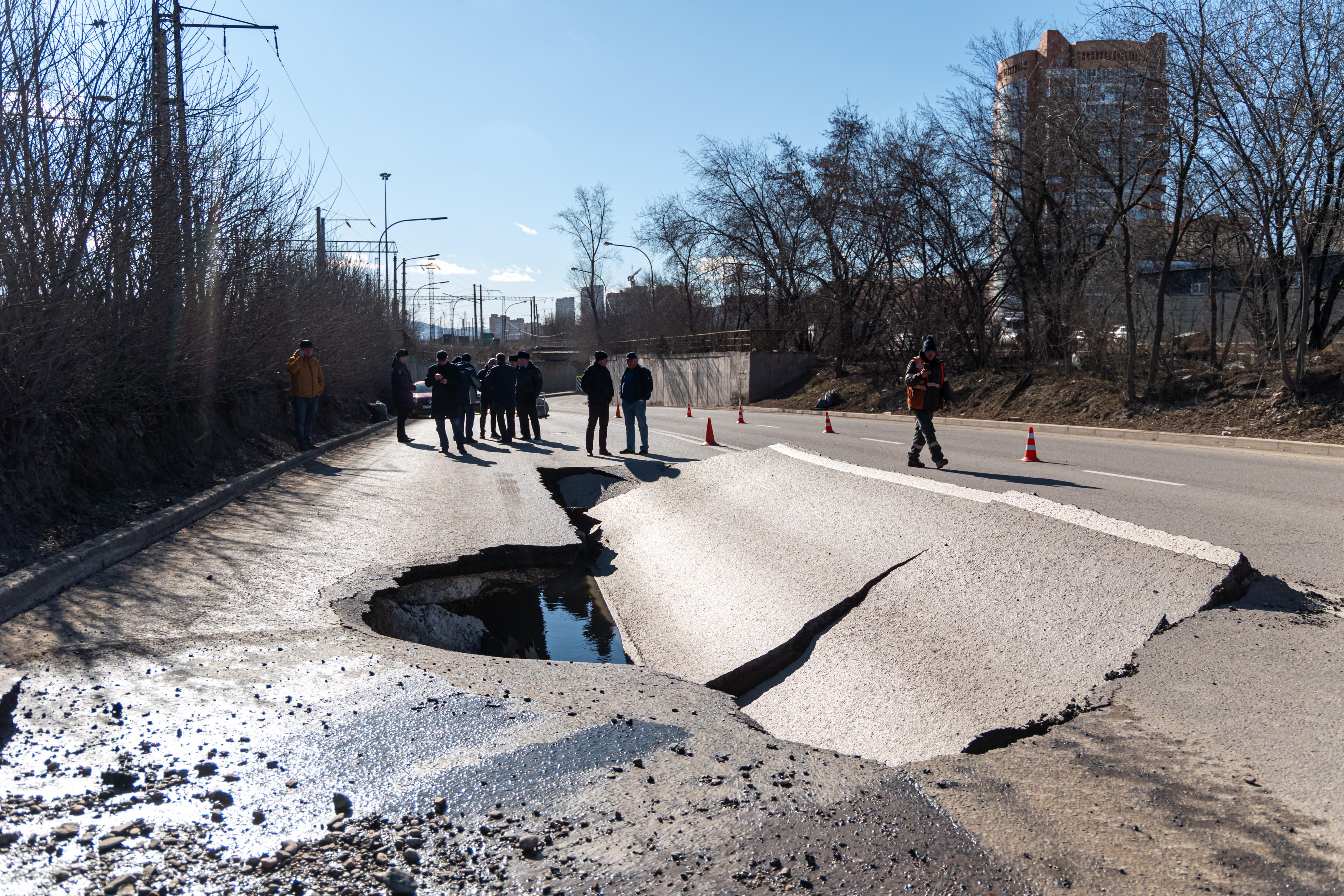 Провал на улице Семафорной в Красноярске, образовавшийся 9 апреля в районе пересечения с улицей Мичурина, до сих пор не устранён. Причиной инцидента стал прорыв канализационного коллектора.