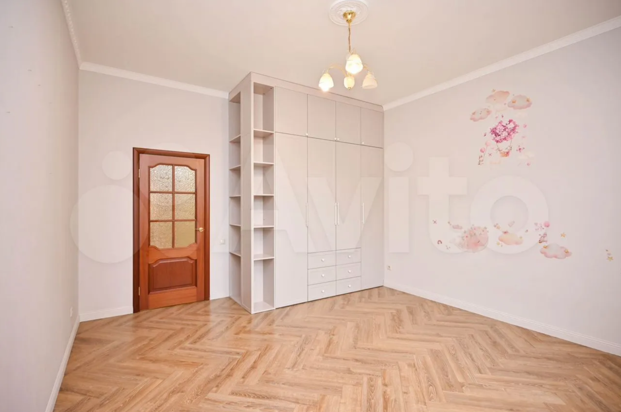 В квартире три комнаты с высотой потолков 3,1 метра. Спальня и детская имеют площадь примерно по 20 квадратных метров каждая, а кабинет — 10,6 кв. м. Кухня оснащена гарнитуром, а в совмещенном санузле установлена ванна на пьедестале.