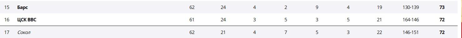 Красноярский хоккейный клуб «Сокол» завершил выступления в чемпионате Высшей хоккейной лиги, заняв итоговое 17-е место и не сумев пробиться в плей-офф.
