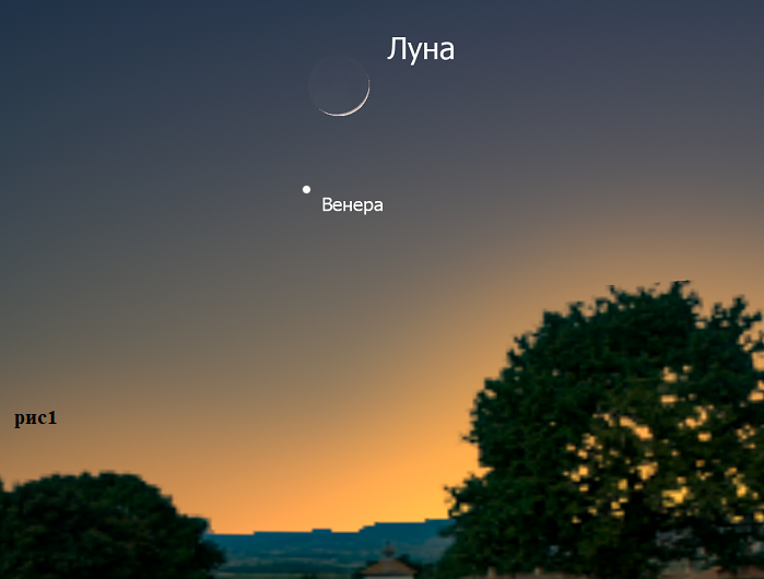 Иллюстрация показывает, как будет выглядеть сближение молодой Луны и Венеры вечером 19 апреля.