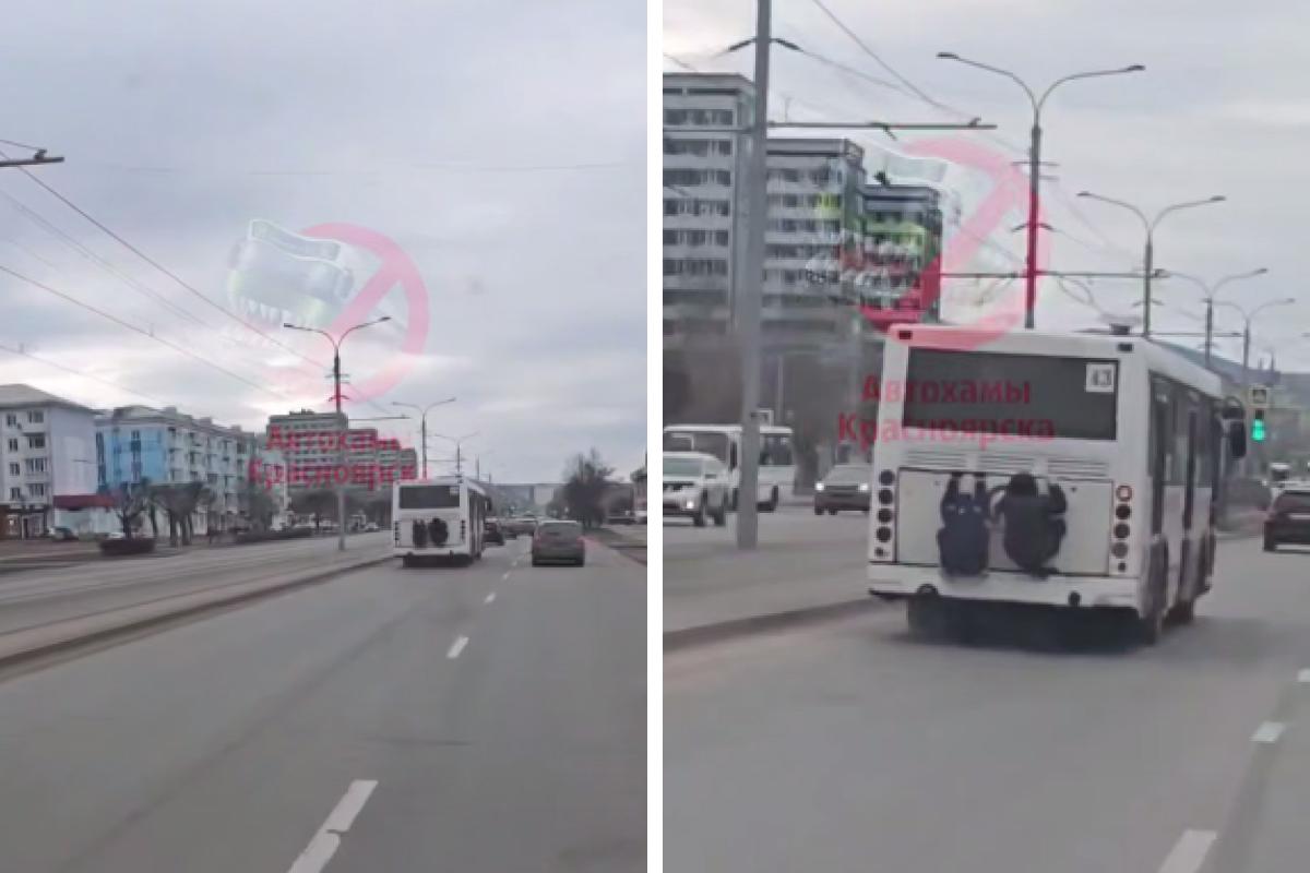 Видеозапись, на которой двое молодых людей цепляются за заднюю часть автобуса №43, опубликовали в сообществе «Автохамы Красноярска».
